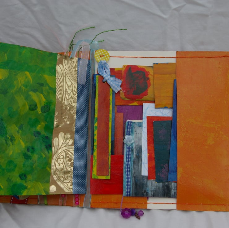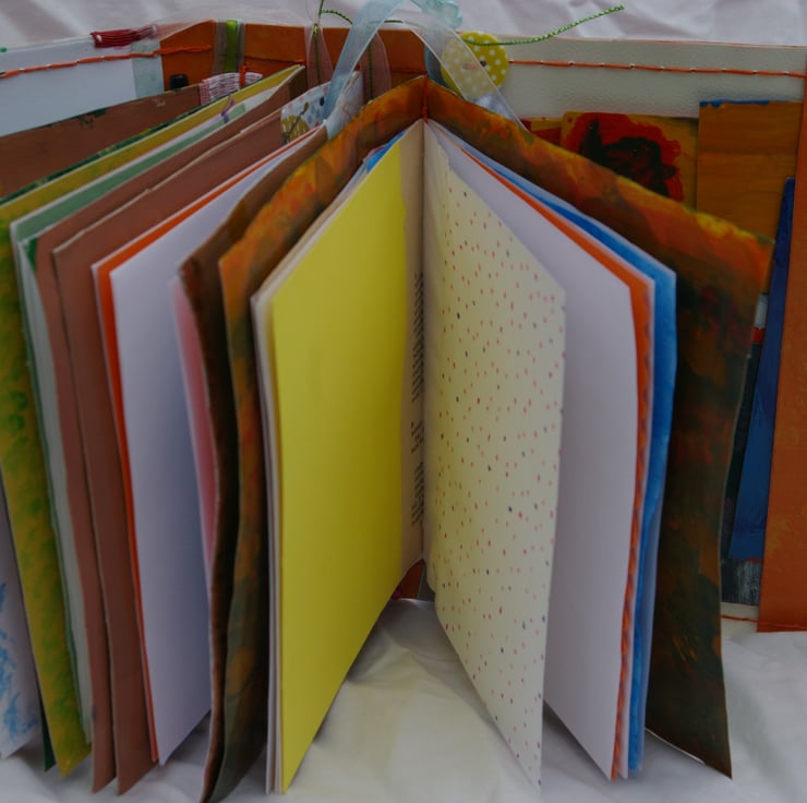 The book contains four separate signatures which each contain a mix of pages for writing poems, notes, saying, adding embellishments, drawings, paintings or for sticking in keepsakes. There are plain white sheets of paper, coloured card and paper, reclaimed paper, pattern and painted pages.