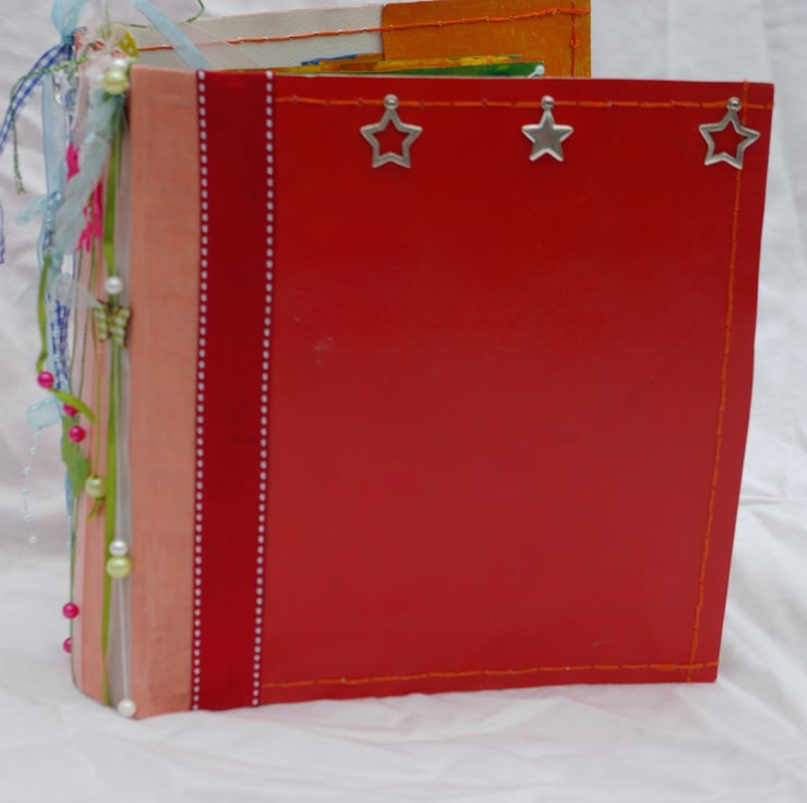The segments have been hand sewn to into the journal and there is hand stitching in orange embroidery thread all around the red painted cover.