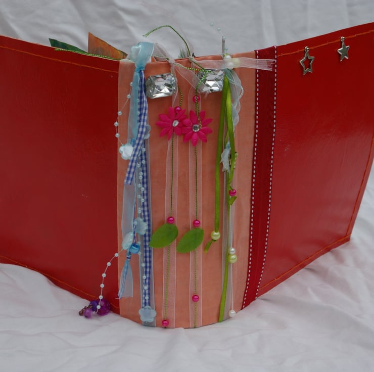 A large upcycled Scrapbook or Smash Journal made from a selection of up cyclced and new materials.