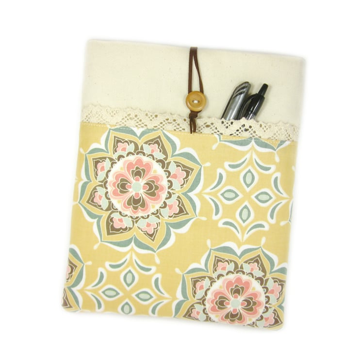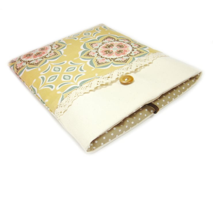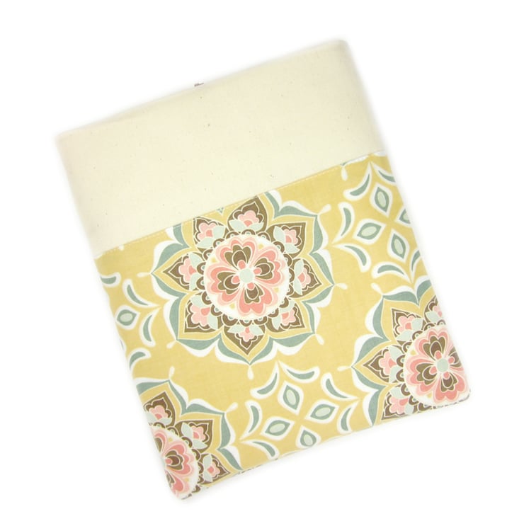 A golden yellow fabric iPad case with modern flower shapes in shades of pinks, duck egg blue and chocolate. Handmade to order for the iPad and iPad Air, Galaxy Tab 3 10", Nexus 10, Galaxy Note 10, Surface RT and Kindle Fire HD and HDX.