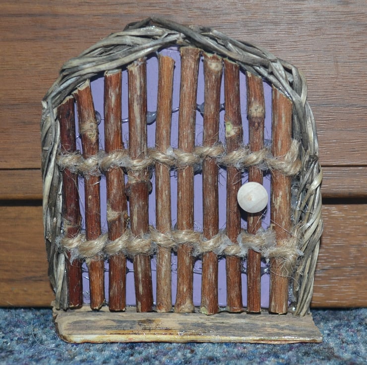 Painted wooden fairy door decorated with natural embellishments - twigs, twine, etc. These little doors look lovely placed against a skirting board, bookcase or just against the wall. The door is supplied with double sided tape on the back. They should not be placed outside unless you place them in a protected area, but do expect the natural elements to have an effect over tume. Fairy doors bring a touch of magic to the home and encourage the little folk to visit and open the portal between their world and ours. This item is approximately 8.5 cm (3.3 inches) wide and 9.5 cm (3.75 inches) high.