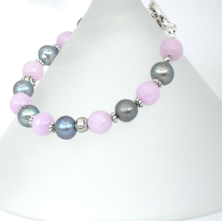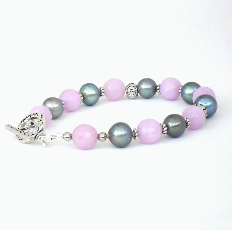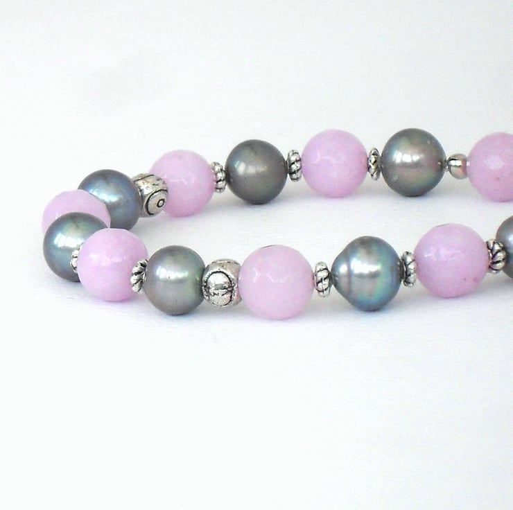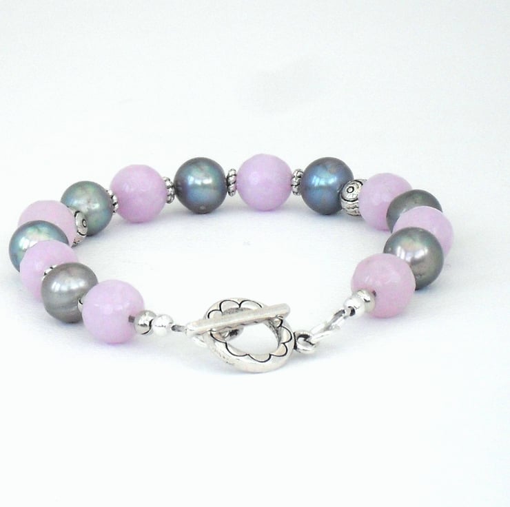 A very pretty handmade and unique bracelet, made with peacock silver pearls and delicate lavender jade.