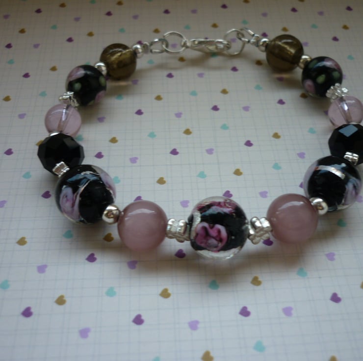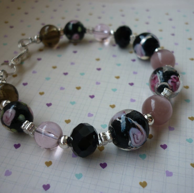 THE BRACELET HAS BEEN MADE WITH HANDMADE GLASS LAMPWORK BEADS IN BLACK WITH PINK FLOWERS ALONG WITH A SELECTION OF CONTRASTING GLASS BEADS IN SHADES OF BLACK AND PINKS ALONG WITH SILVER PLATED ROUND SPACER BEADS, SILVER PLATED DAISY SHAPED SPACER BEADS AND FINISHED WITH SILVER PLATED LOBSTER CLASP AND FINDINGS.