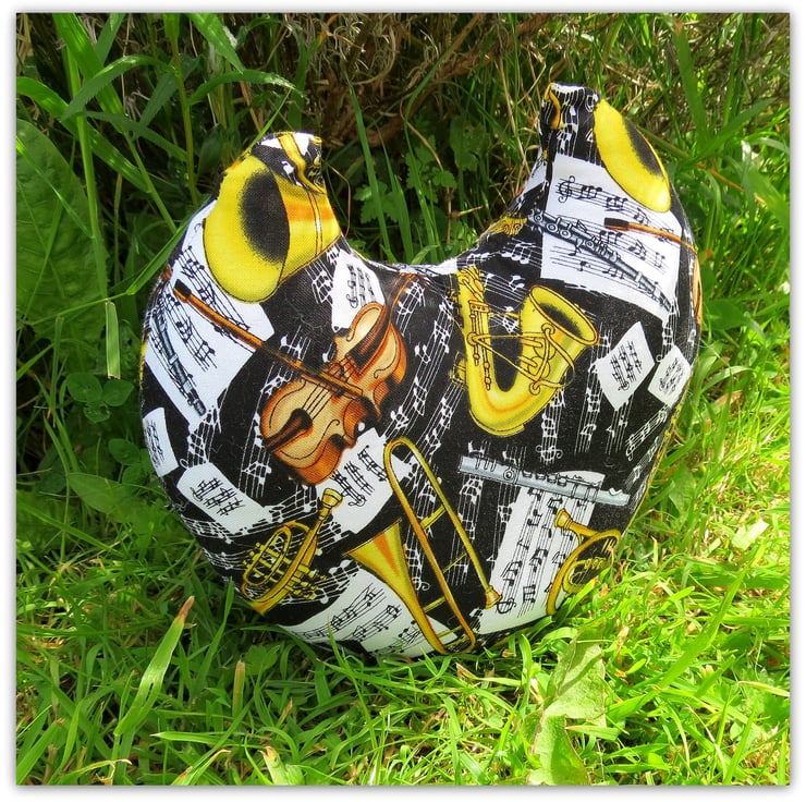 The background fabric is a vibrant cotton featuring various musical instruments, and his wings are edged with ric rac.