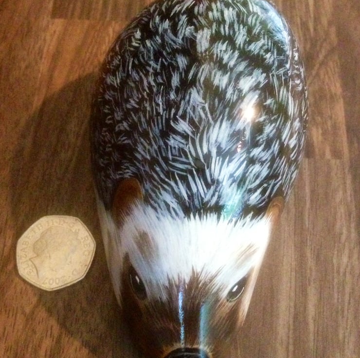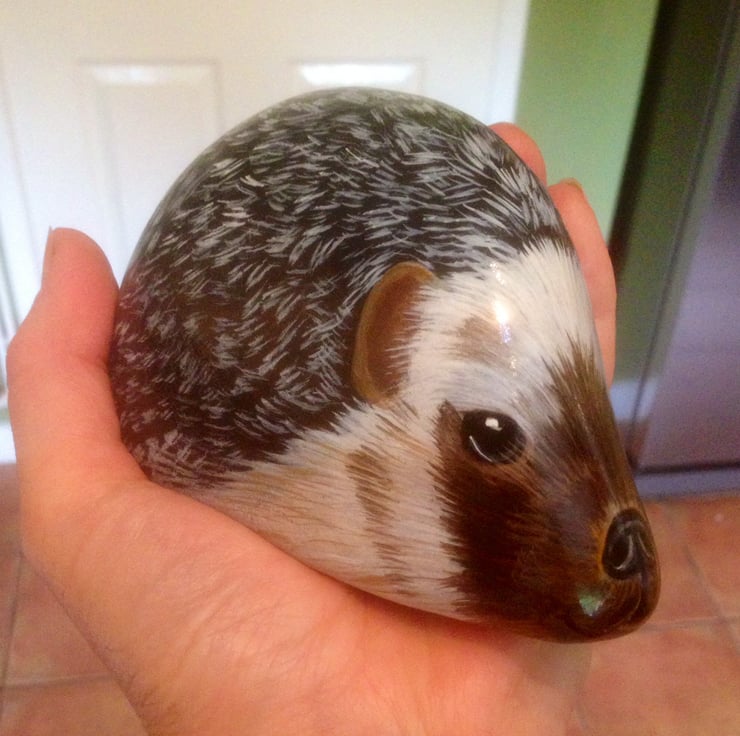 This hedgehog has been hand painted onto a large smooth shaped stone in acrylics and glazed with an outdoor hard wearing glaze. Suitable for indoor or outdoor use.