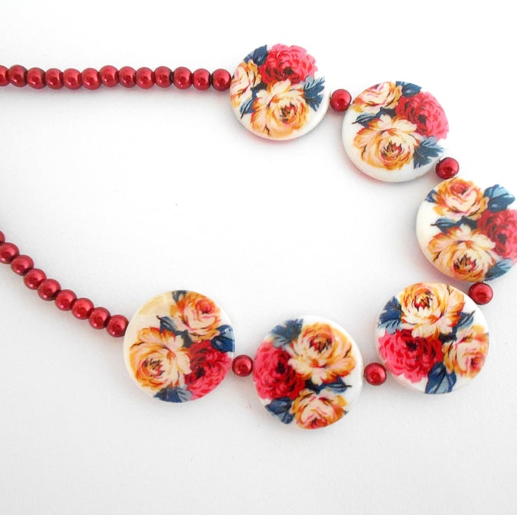 This is a lovely necklace made with 20mm round flat roses shell beads. The upper body of the necklace is 4mm round glass pearls in a beautiful scarlet colour, which complement the colour of the roses on the shell beads. The necklace measures 47cm (18.1/2") and is finished with a silver toggle clasp. As all of the items in my shop are indiviual pieces made by myself, this is the necklace you will receive. It will arrive gift wrapped in tissue paper and a organza bag.
