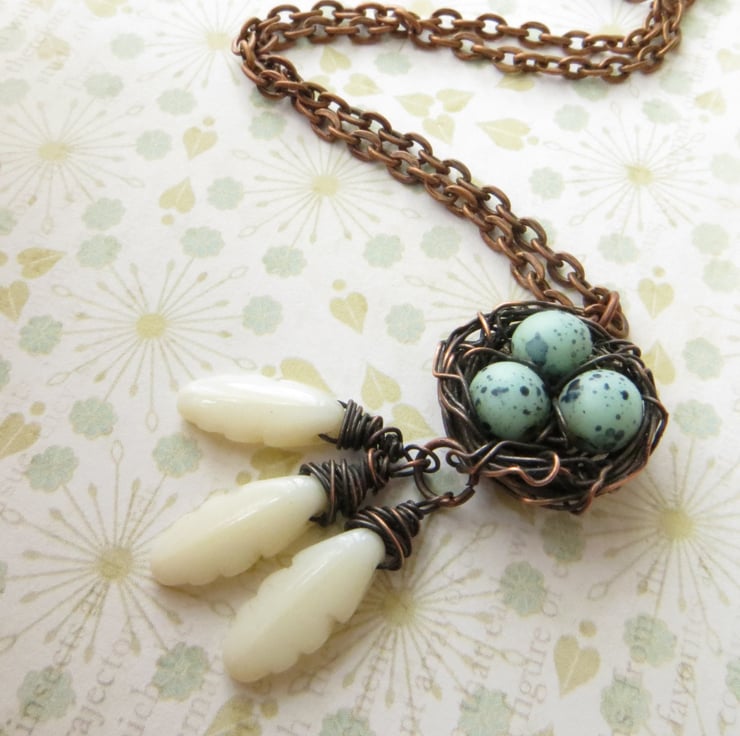 This unusual birds nest pendant features a handmade copper nest filled with three robins egg blue glass beads. I've also added three white feather beads wire wrapped in copper to the bottom of the nest for movement and detail.