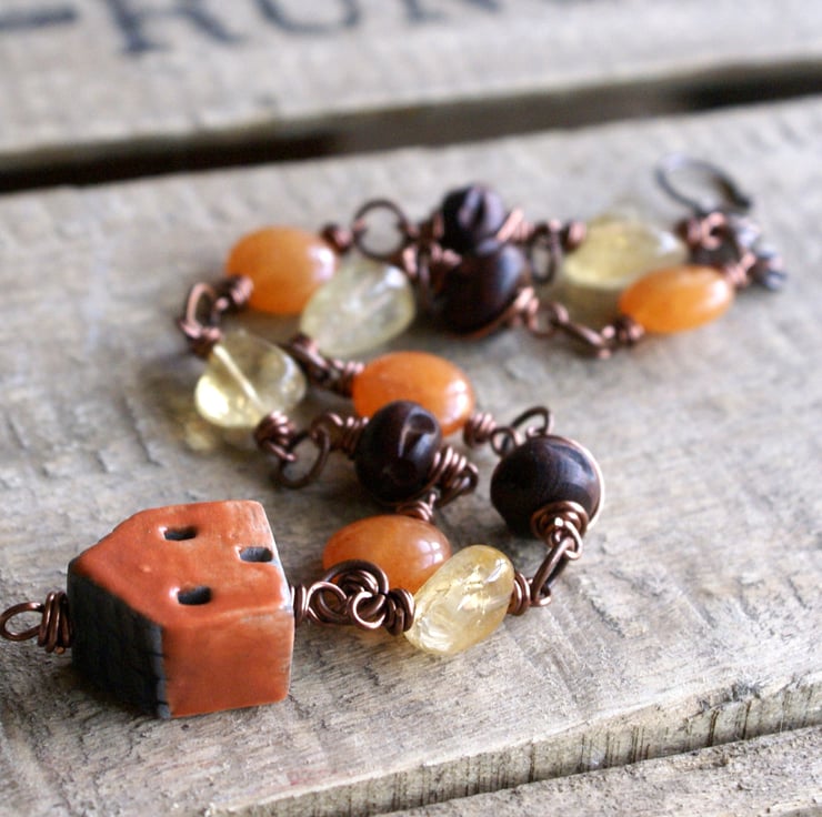Rustic Citrus - Wire Wrapped Gemstone Bracelet with Artisan Miniature House Bead