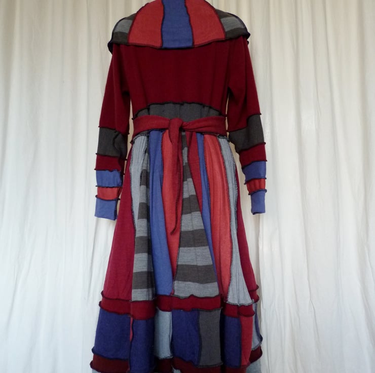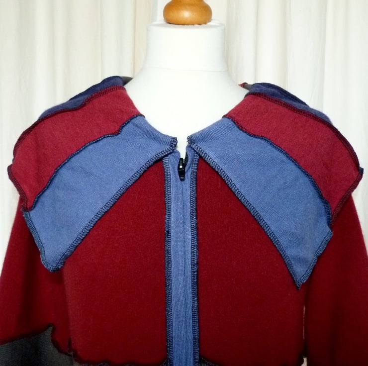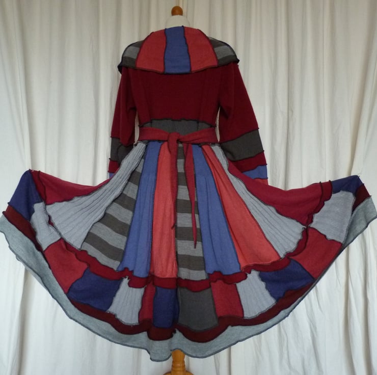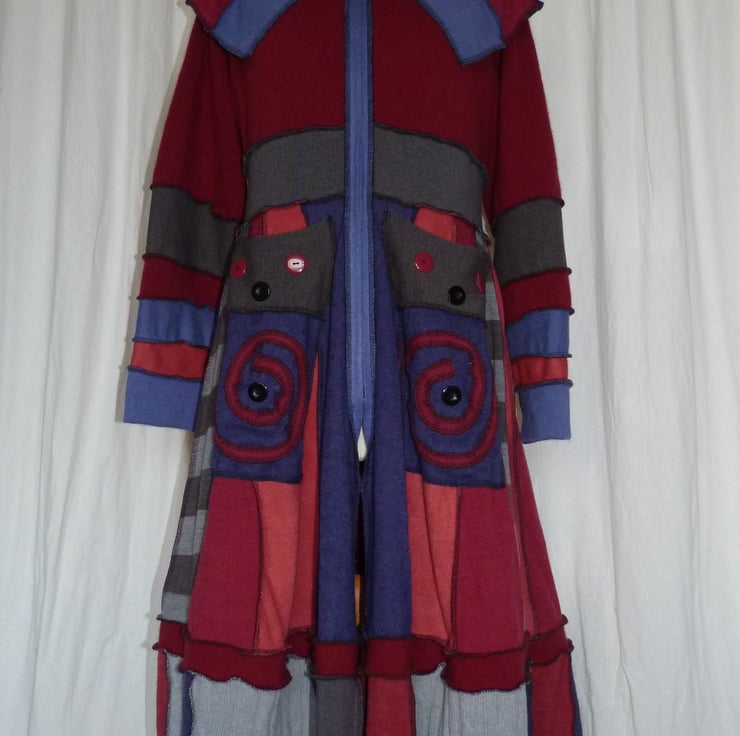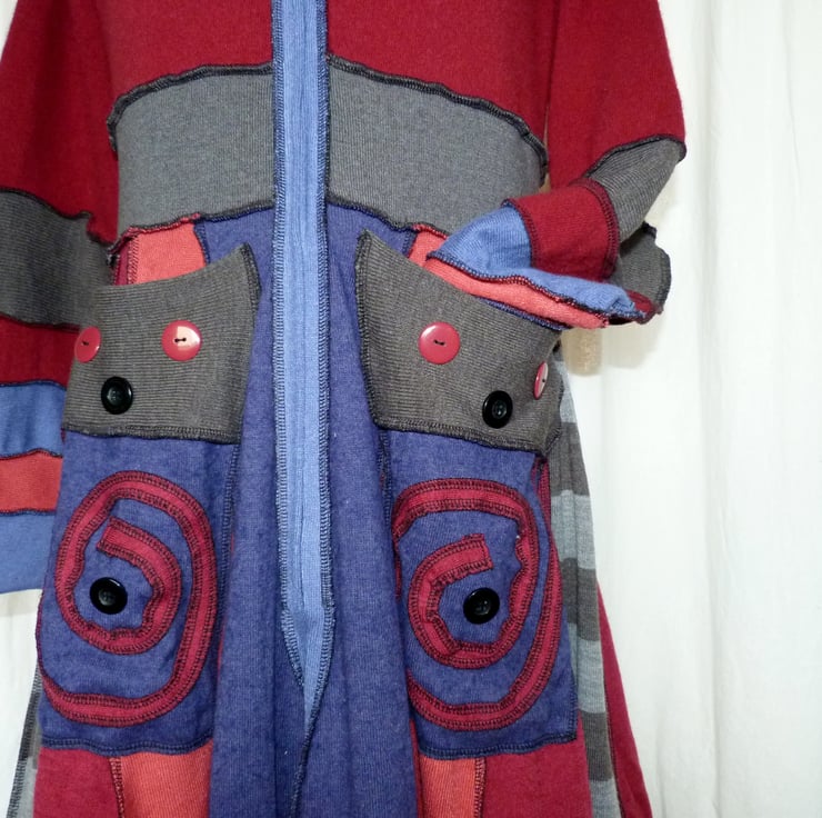 This fantastic up-cycled coat is created from wool, angora, cotton and acrylic jumpers. These are previously loved and recycled jumpers, that I have washed in a hot temperature and pre-shrunk. I have then cut and re-stitched the jumpers, with all seams being professionally finished with a serger/overlocker, to create this fabulous coat.