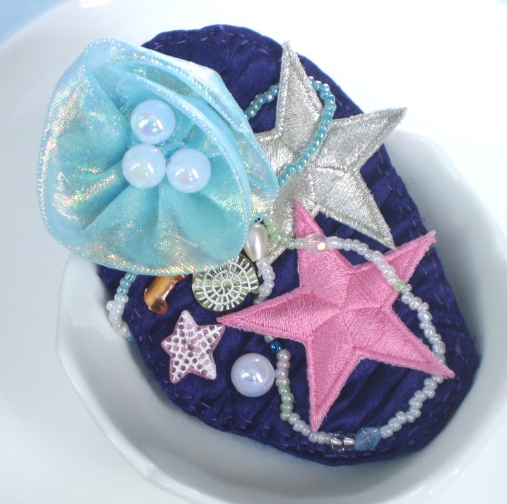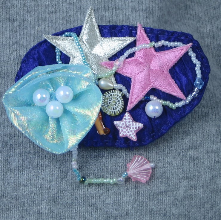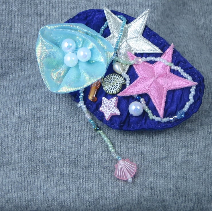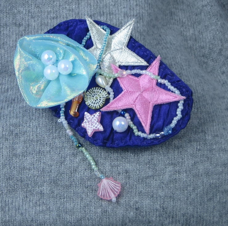 This large striking brooch has been hand-stitched with applique starfish, fabric and beads. A great addition to a jacket or hat for a special occasion. 9cm at its widest point. A lovely gift for a Birthday. 30mm pin with safety catch.