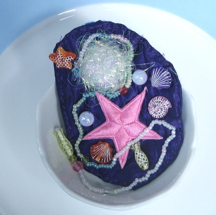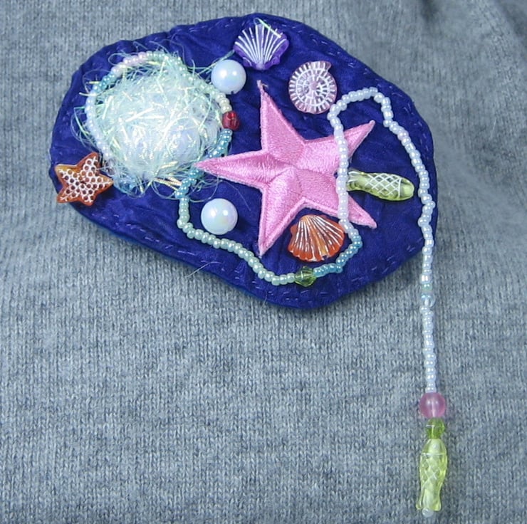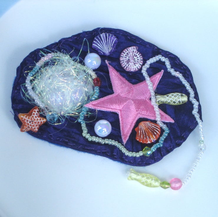 This large striking brooch has been hand-stitched with applique starfish, fabric and beads. A great addition to a jacket or hat for a special occasion. 9cm at its widest point. A lovely gift for a Birthday or Mothers' Day. 30mm pin with safety catch.