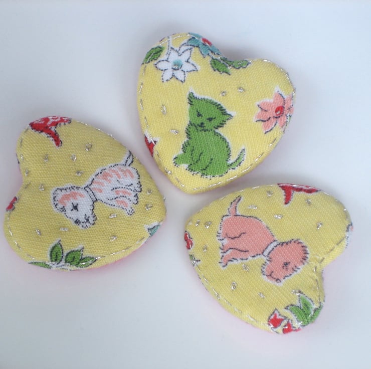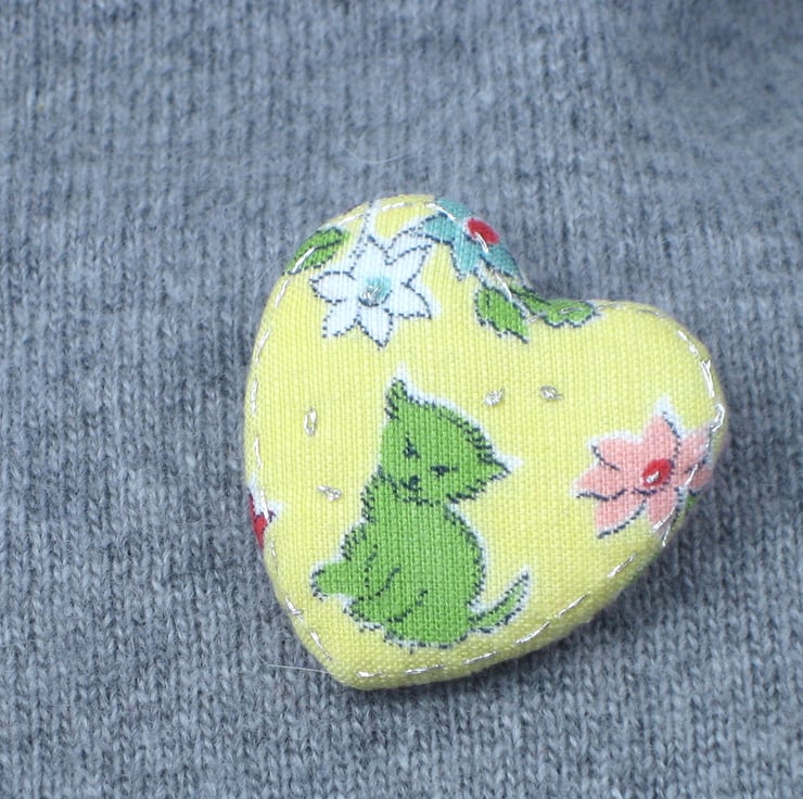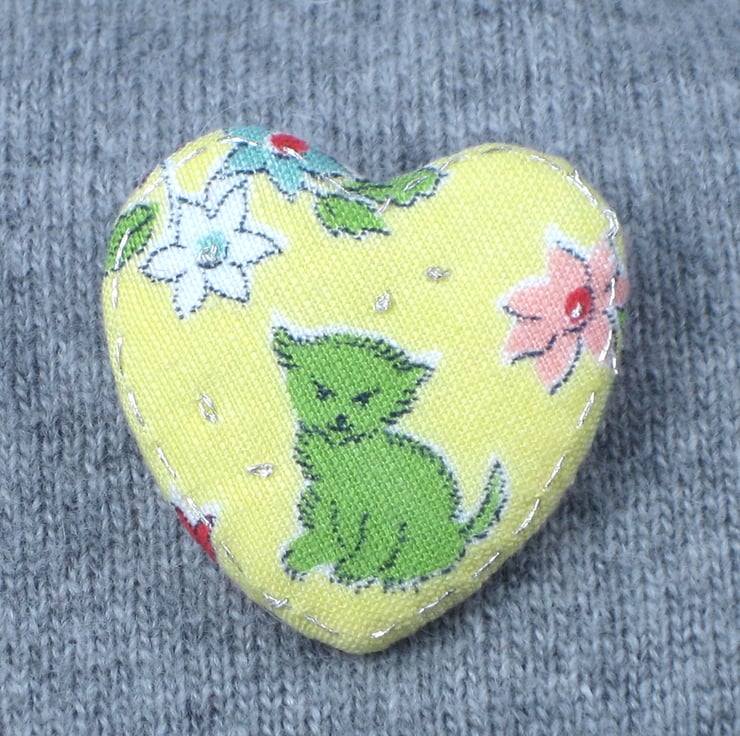 This sweet little brooch has been made from vintage fabric from the 1950s, and features a grumpy green kitten. It has been embellished with silver thread and backed in pink felt. Measuring 4 x 4cm it has a 25mm pin with safety catch. Let me know which other brooch (included in the offer) that you would like.