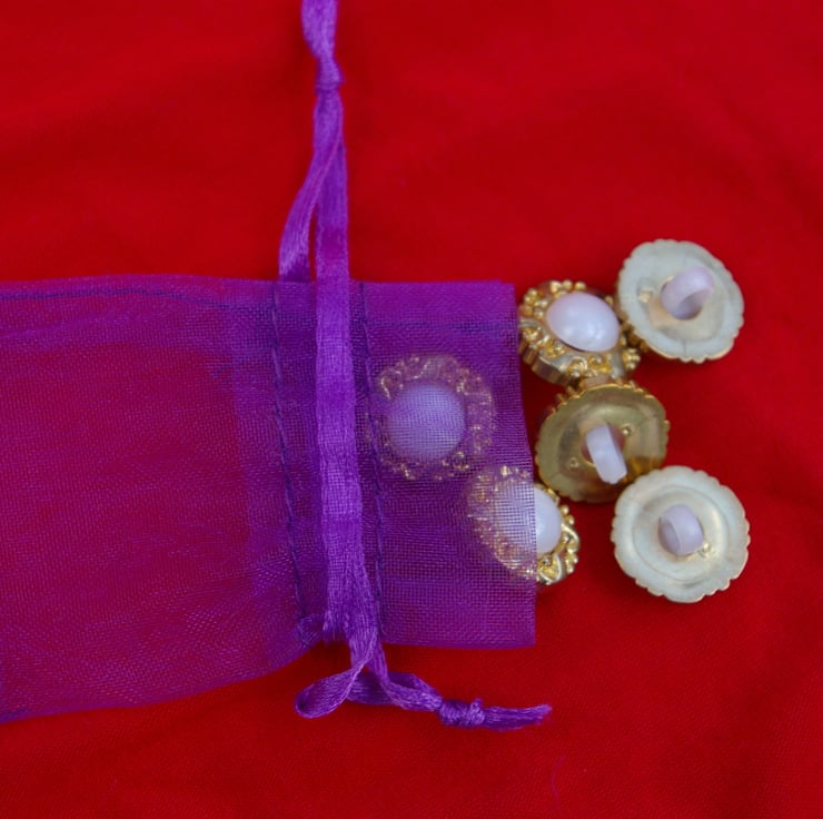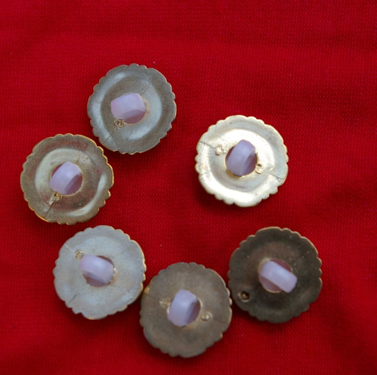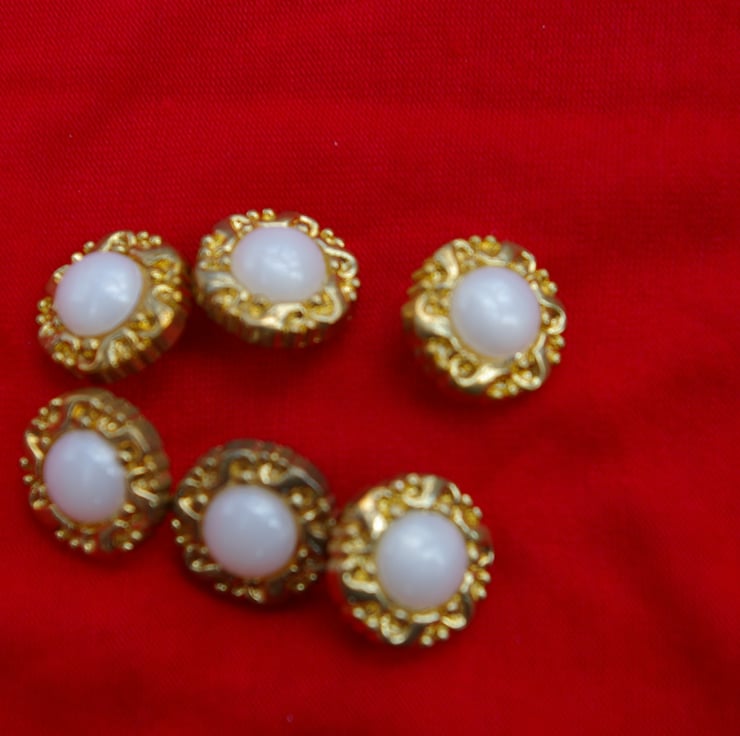 Six small Vintage, Buttons. Each button is made from plastic with a pearlized white centre dome surrounded in a gold colour patterned edge. They have a white sewing loop shank on the reserve side.