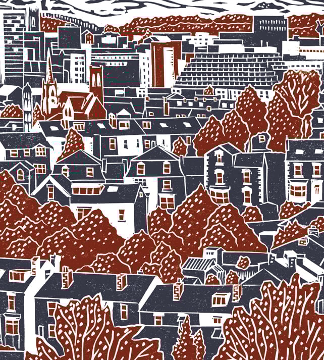 The poster is a professional digital print of an original linocut. It is printed on high quality 200g cream paper, hand-titled and signed.