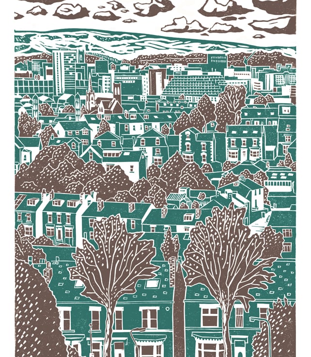 The poster is a professional digital print of an original linocut. It is printed on high quality 200g cream paper, hand-titled and signed.