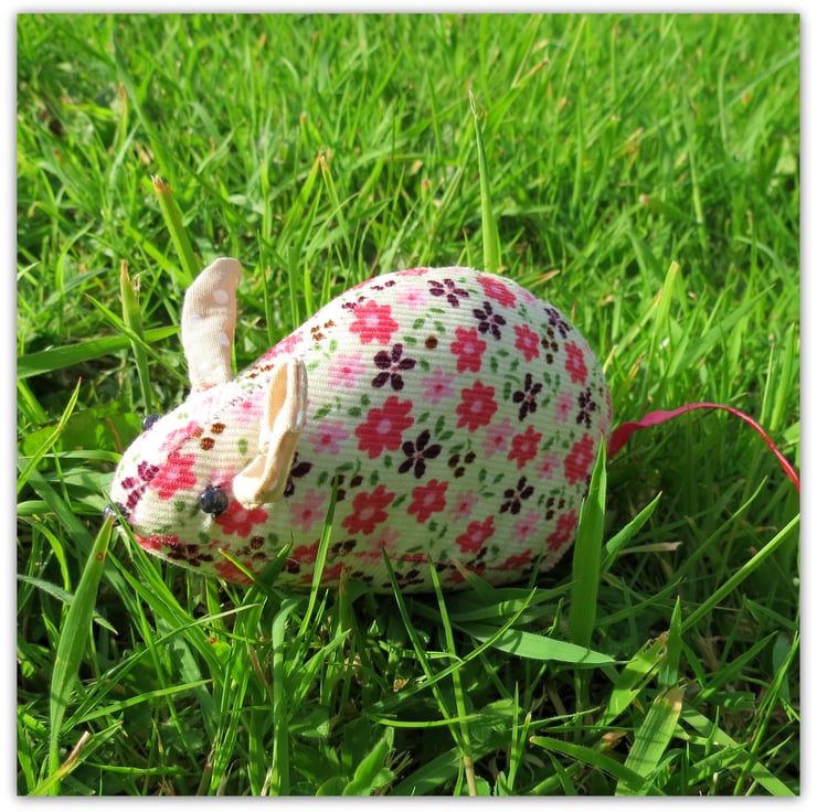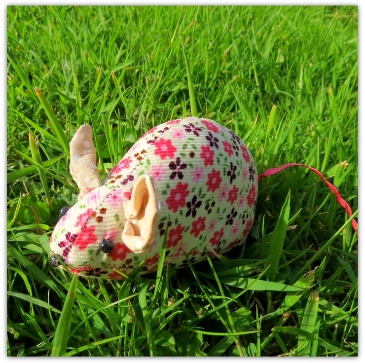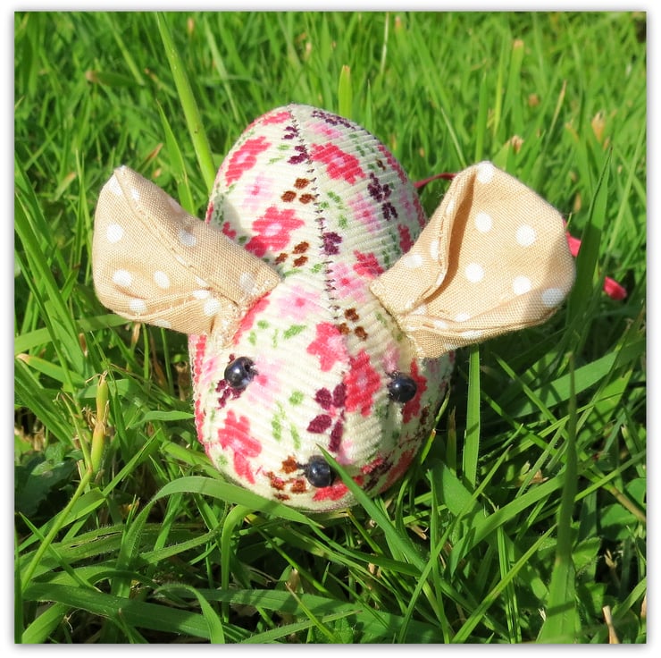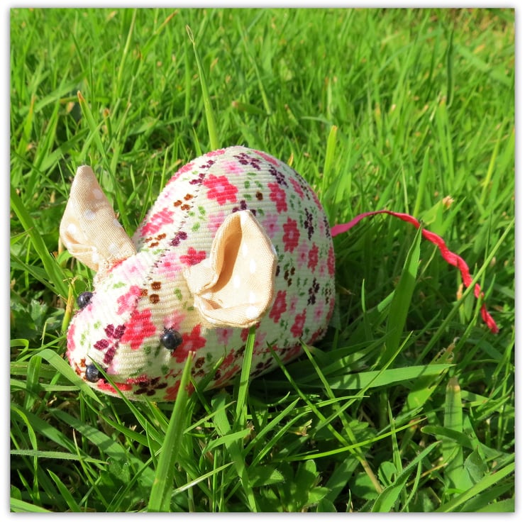 This sweet field mouse pin cushion measures 11.5cm in length, excluding the ric rac tail.