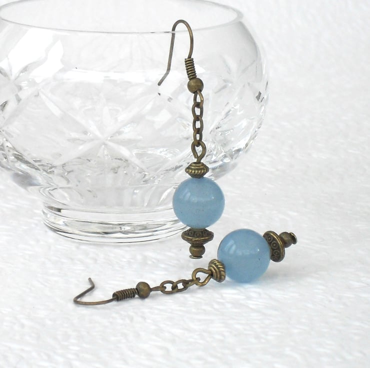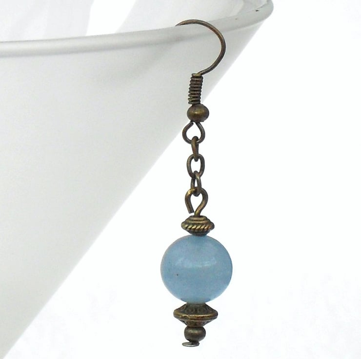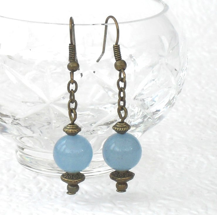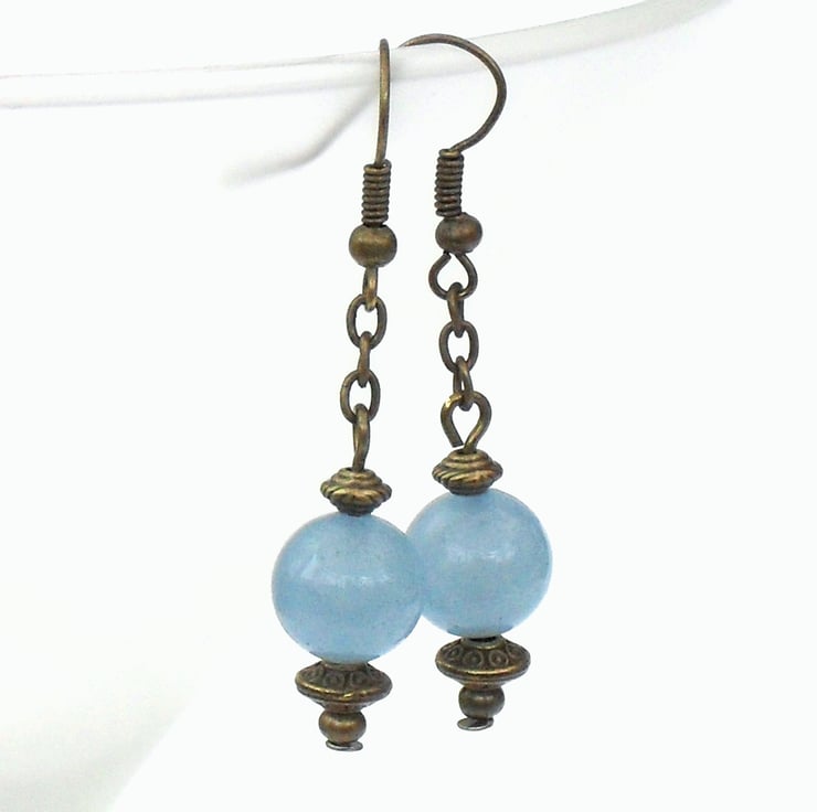 Jade semi-precious gemstones in a beautiful shade of blue hang with bronze wires, chain and rondelles.