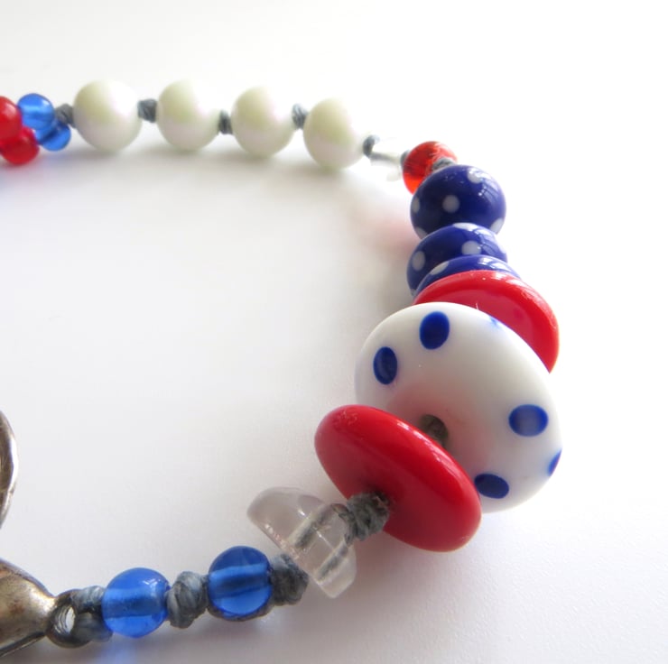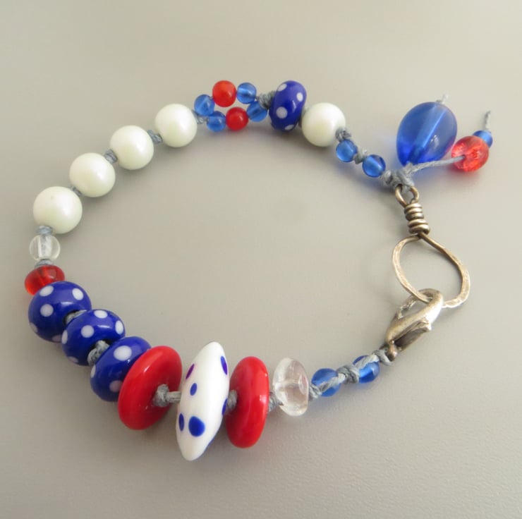 This cute nautical bracelet is packed full of gorgeous beads - polka dot lampwork beads from Puffafish Lampwork, a spotty lampwork disc from Helen Chalmers, czech glass and glass pearls. It is securely knotted onto linen cord which drapes beautifully and fastens with a lobster clasp and handmade hammered loop. The silver plated parts have been oxidised to add contrast to the coloured beads.