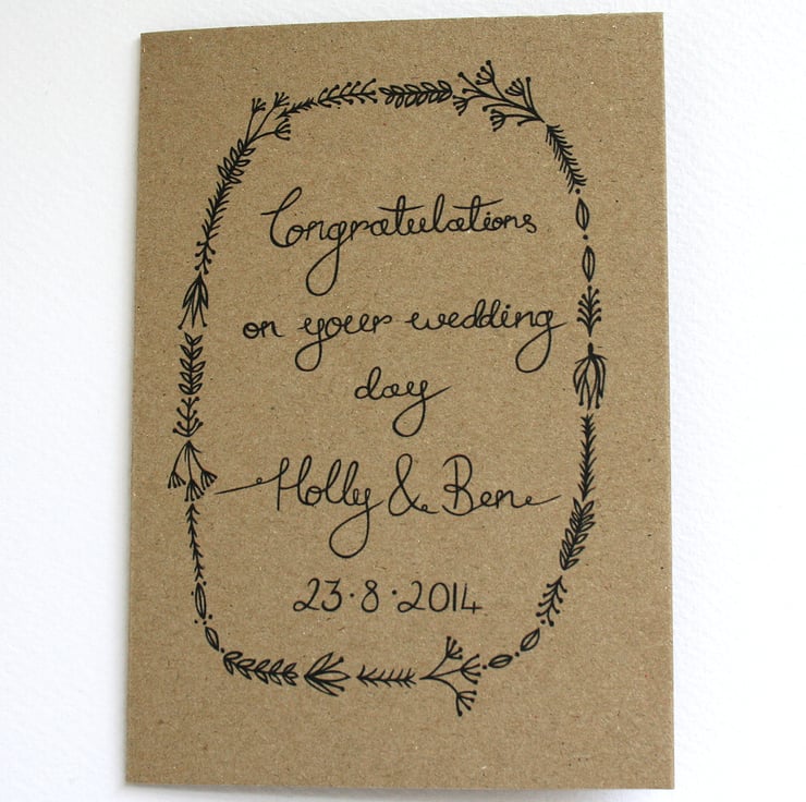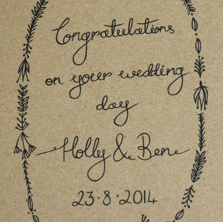 Simple and pretty, personalised congratulations on your wedding day card, with pretty hand lettering and a botanical illustrated frame.