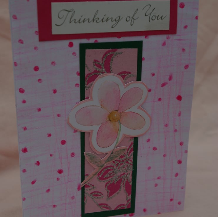 A pretty pink and green ‘Thinking of You,’ handmade card. The centre design to this card is a pink stylized flower. I have mounted the Daisy onto floral pink and silver glitter handmade paper, which in turn is mounted onto dark green card. Above the flower in silver on white card is a title saying, ‘Thinking of You’. I’ve mounted the title onto dark pink card. The whole design is backed by a pink drawn background with darker pink spots.