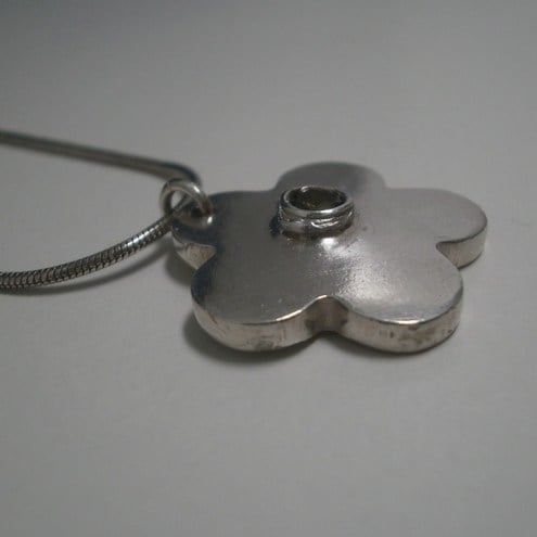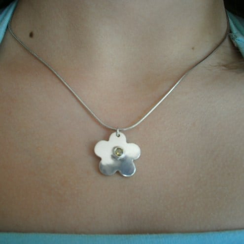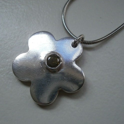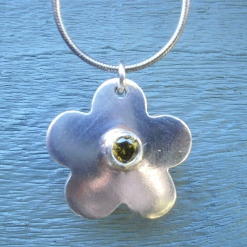 A charming, solid fine silver daisy pendant set with an olive cubic zirconia.
