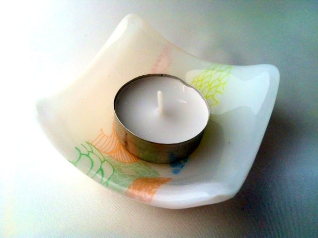 Measuring approx 83mm sq and standing 31mm tall this small white dish is made with two hand-cut layers of glass with a beautiful floral print decal applied in the middle. It was fired in the kiln to 800 degrees Celsius to fuse into one solid piece and left to cool. This process took 12 hours before going back into the kiln for a further 10 hours to form the dish shape. It is perfect as a "Rings 'n' Things" dish or as a tea light candle holder.