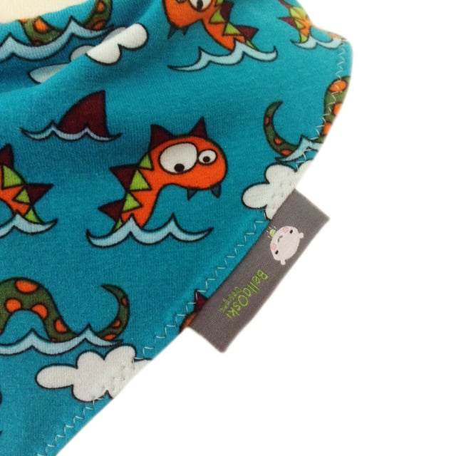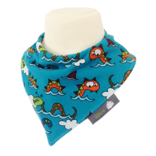 Specially sourced fabric from Germany - this is a gorgeous Cotton Jersey Fabric Baby Bandana Dribble Bib with the cutest of print of the Loch Ness Monster and clouds all over it. Perfect for your gorgeous little onel! Made from 100% Organic Cotton jersey and lined with an ultra soft and absorbent fleece fabric to keep clothes dribble free and looking ULTRA cute!