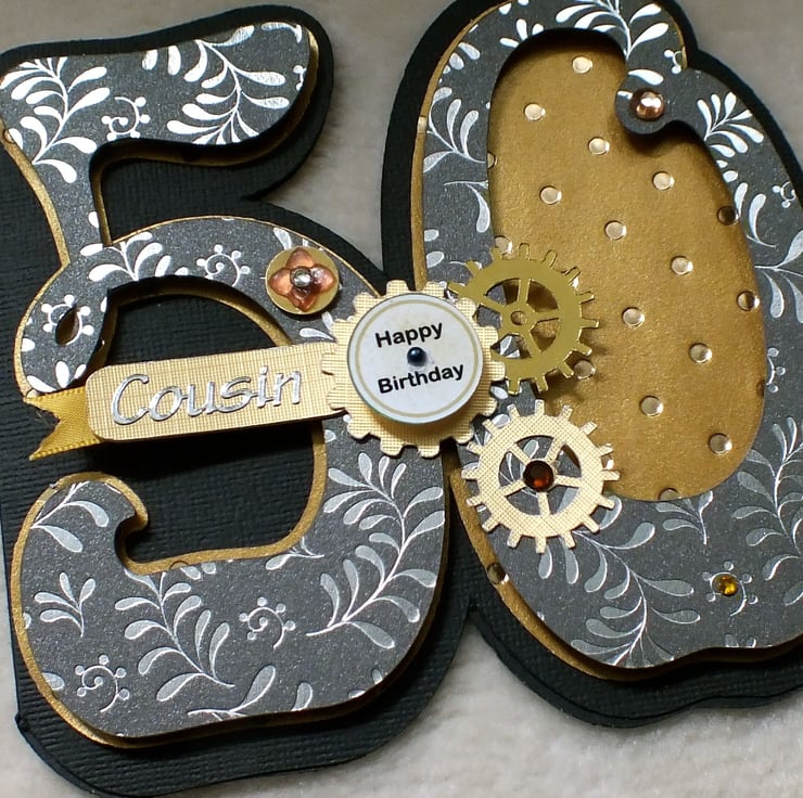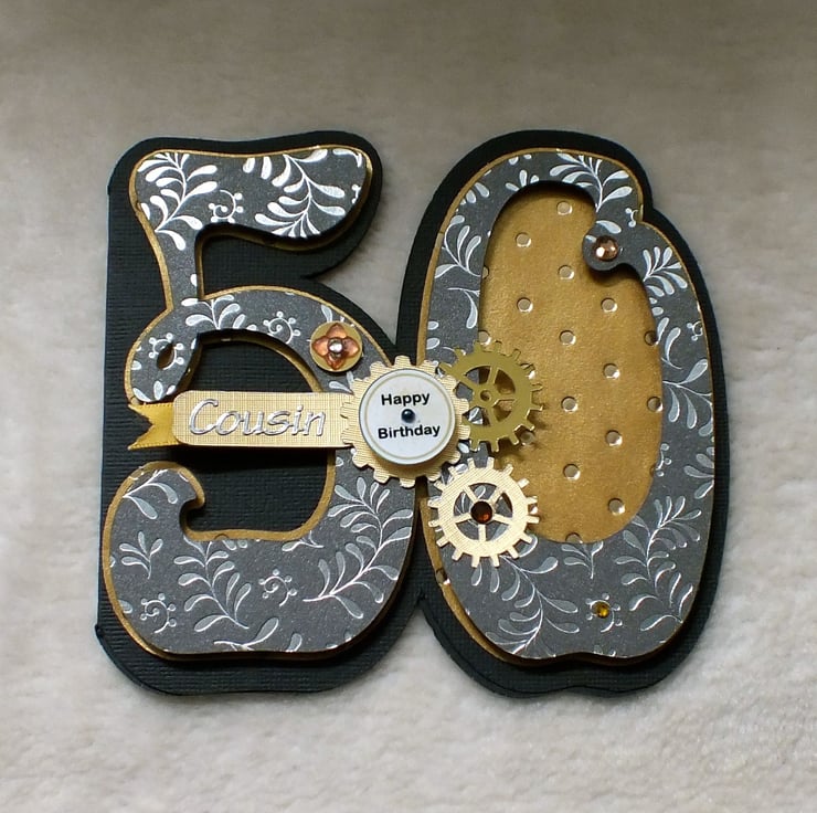 This stylish, die-cut 50th birthday number card is approx. 6x6” in size. The 3D layers are a combination of heavy weight card and embossed paper, in complementary shades of black, gold, and silver-grey, with accents of steam punk embellishments and faux gems. Includes the sentiment, ‘Happy Birthday’, inside.