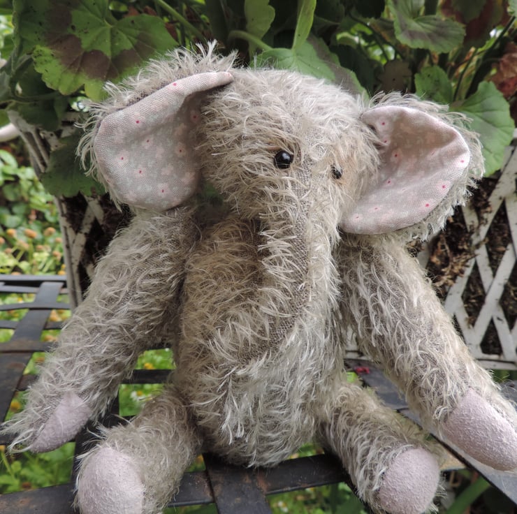 Fully jointed, hand sewn, vintage style elephant. Stands approximately 7" tall, suede paws and a tiny floral print cotton fabric in the ears. This is not a toy...collectors item only.