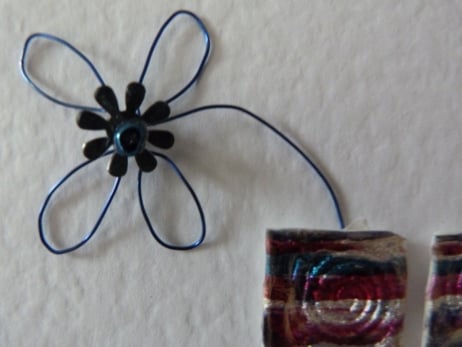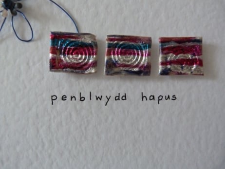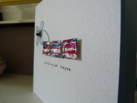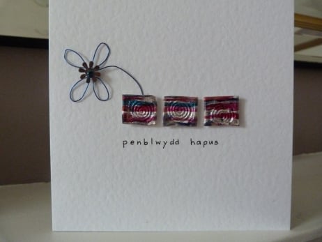 A set of three squares created from silver with cerise, emerald and royal blue striped meldable plastic which have had a spiral design embossed onto each one. Placed in a row horizontally across the middle of the card. Behind the first square is a flower made from royal blue wire with a silver sequin centre finished off with a royal blue bead. The words Penblwydd Hapus meaning Happy Birthday handwritten below the squares. All mounted onto quality white hammered card.