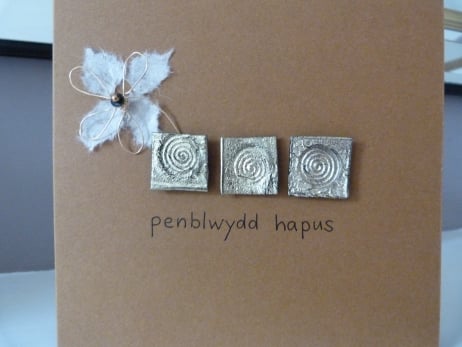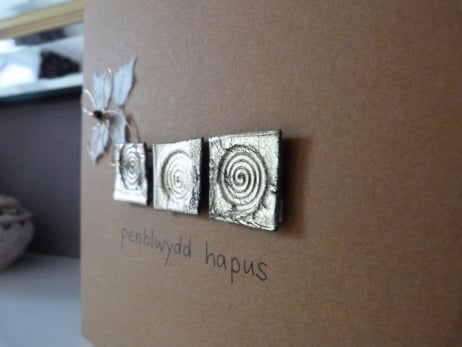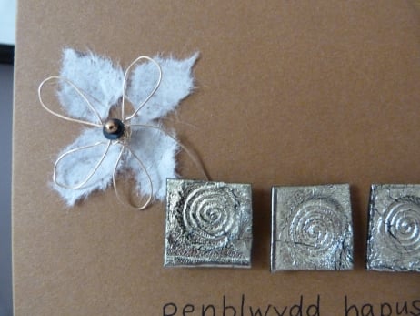 A pale brown quality card which has been decorated with three squares made from gold meldable plastic which have been placed horizontally and which have been embossed with a celtic spiral design. Further embellished with a daisy flower made from gold wire with the petals made from ivory silk handmade paper, the centre of the flower is a sequin and gold bead. The words penblwydd hapus hand written in black ink.