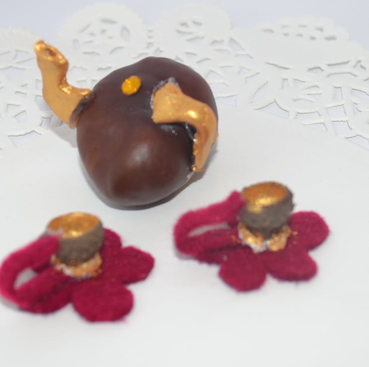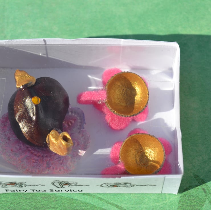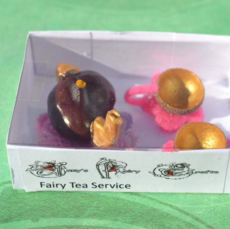 Fairies love to have tea and a natter, so every fairy needs a good tea service. This tea service has little acorn tea cups on felt flower bases, and a conker tea pot with beautiful lines and gold accent.