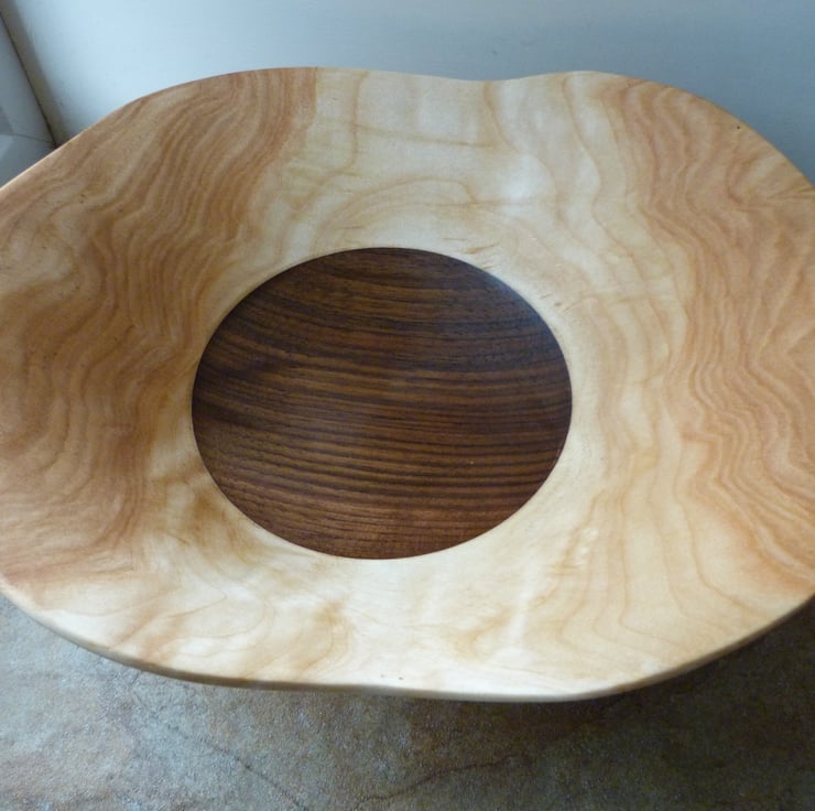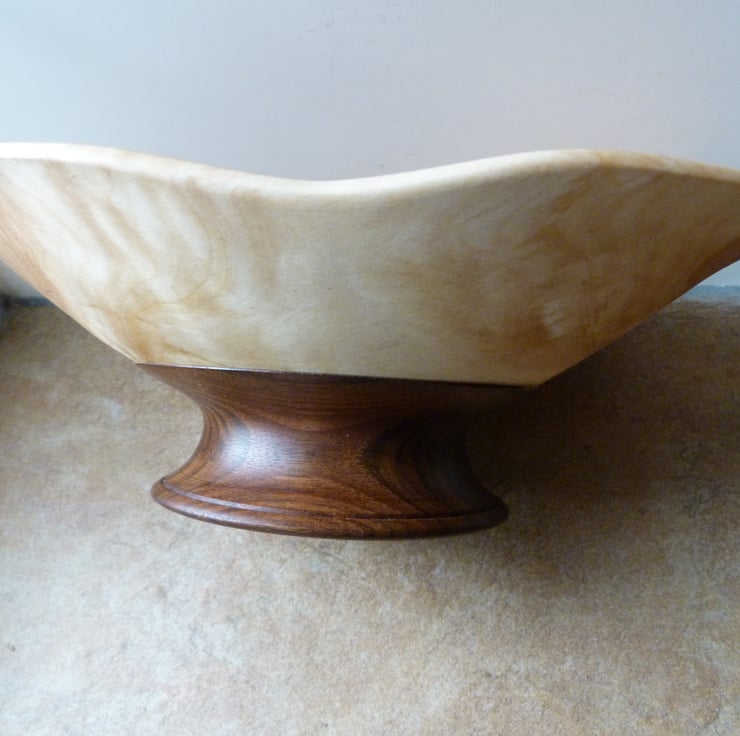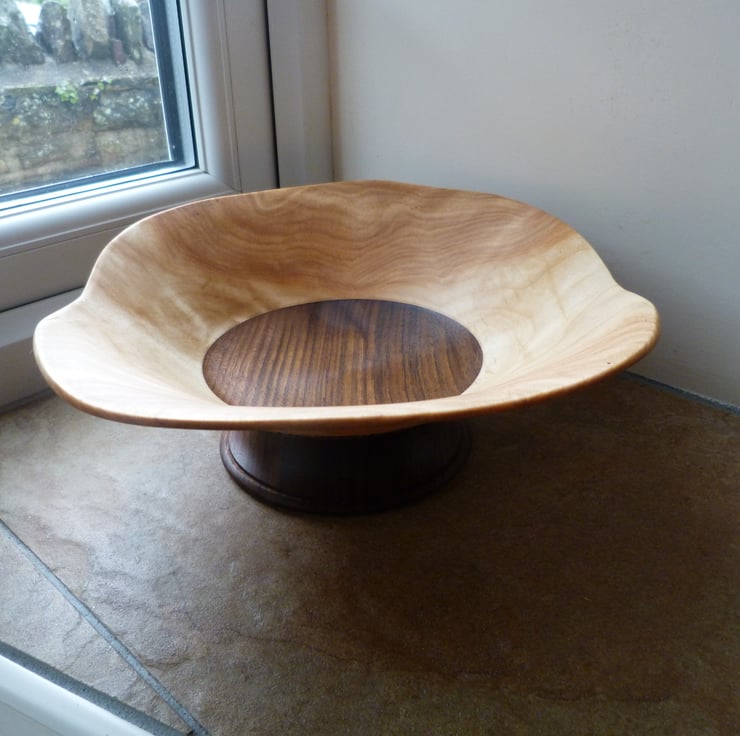 Made from two english woods, poplar and walnut, this is another bowl that can have many uses. The poplar was turned green therefore in time the shape will alter as the wood completely dries, wall thickness is just 5mm. Finished in walnut oil, 4'' high and 11''at the widest point.