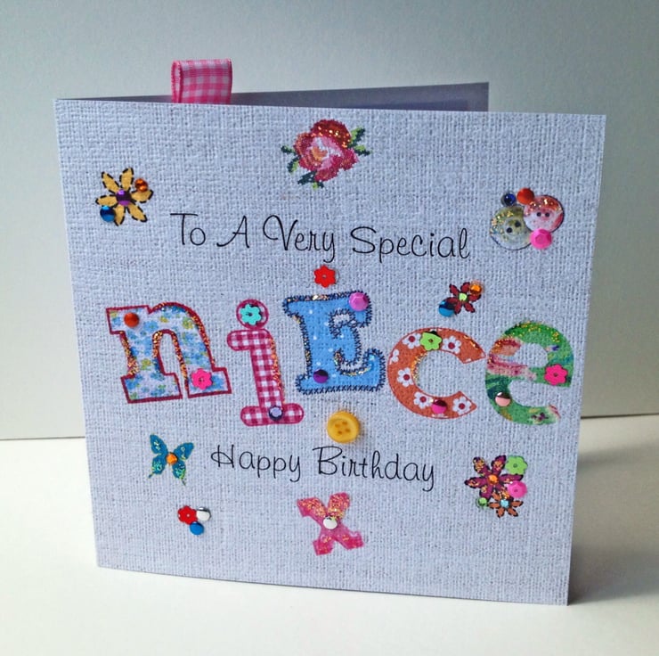 The Applique work is the main design as it spells out the 'Niece', with smaller text for the remainder of the greeting.