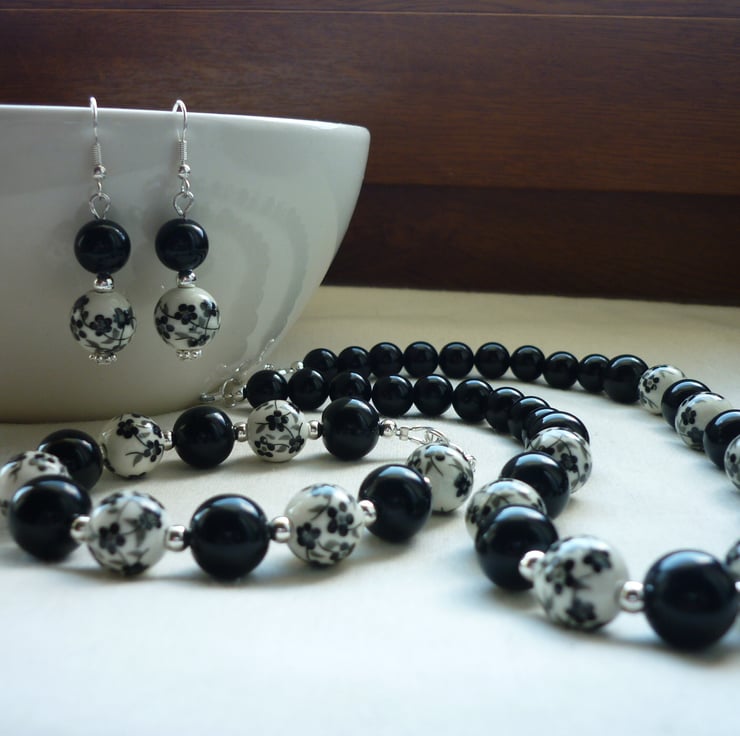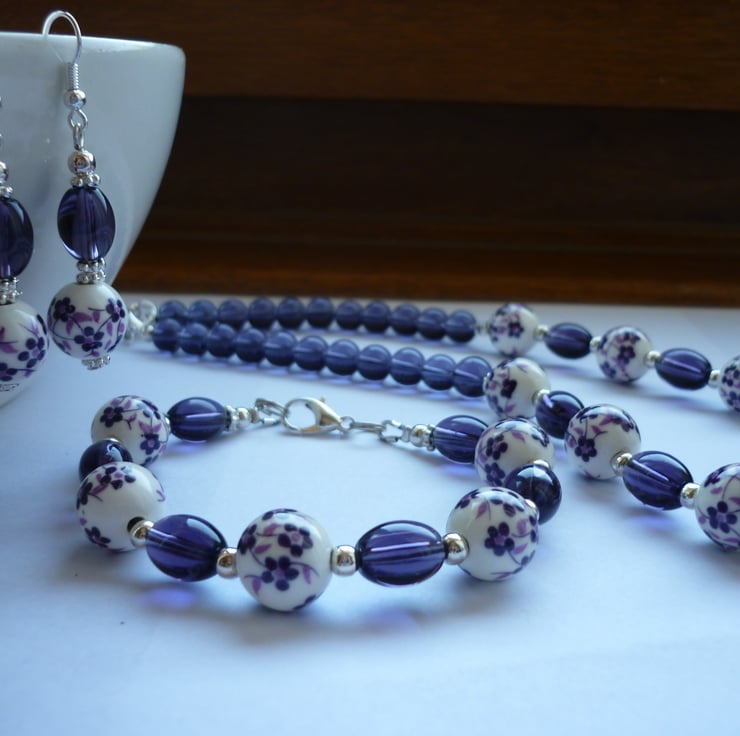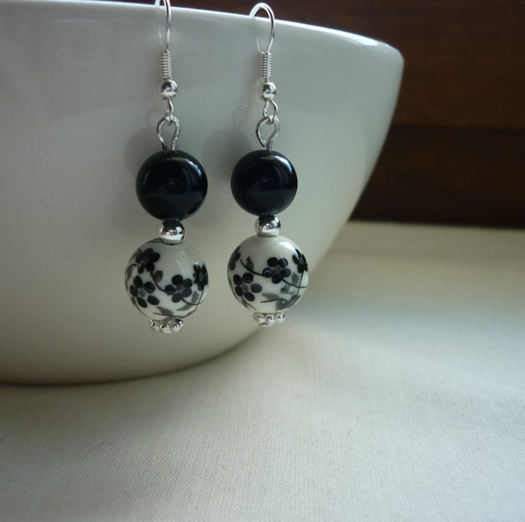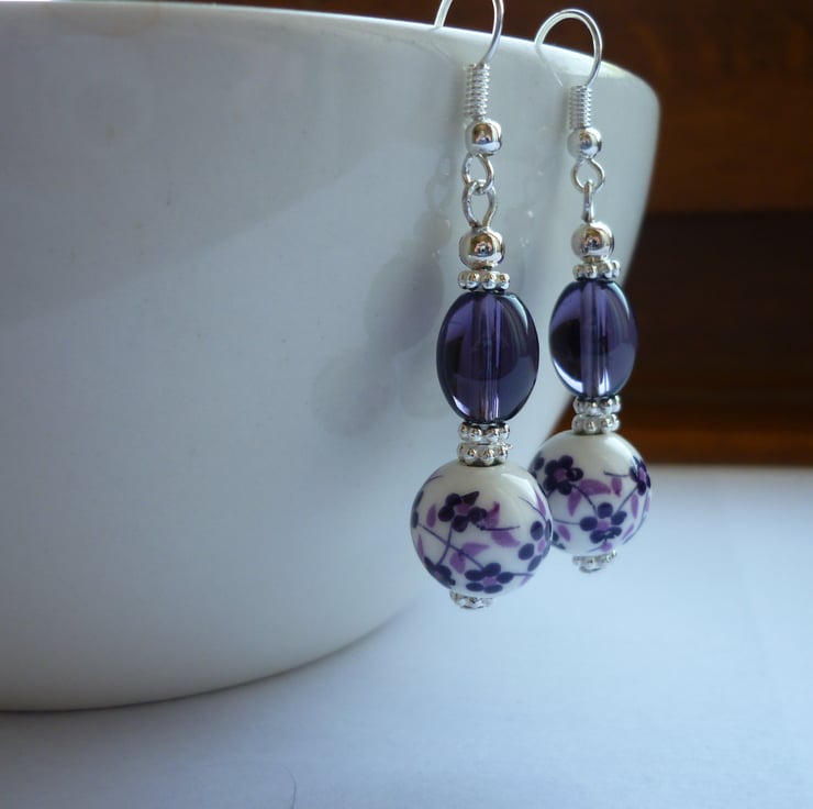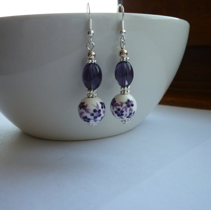 THE EARRINGS HAVE BEEN MADE USING 12MM PURPLE AND WHITE FLORAL PORCELAIN ROUND BEADS, OVAL SHAPED GLASS BEADS IN PURPLE, SILVER PLATED DAISY SPACER BEADS, ROUND SILVER SPACER BEADS AND FINISHED WITH SILVER PLATED FISH HOOK EAR WIRES.