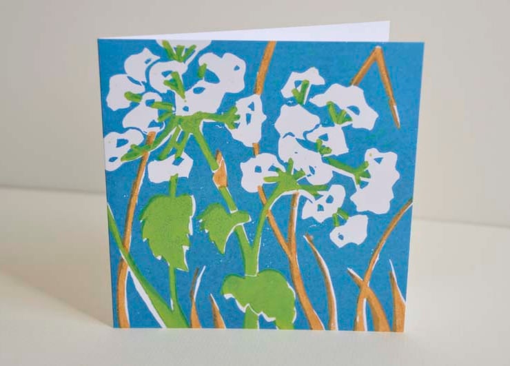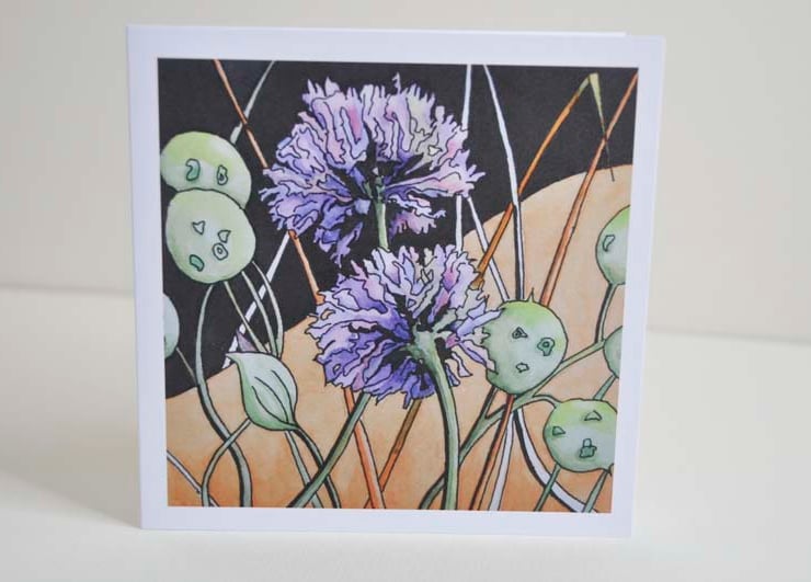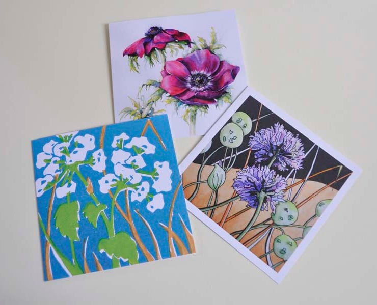 Pack of three beautiful greeting cards designed specially for gardeners. printed professionally from original watercolour painting and lino prints. Each measures 148 mm x 148 mm ( Approx 6 " x 6 " ) and printed on 310 gms quality card each with a white envelope and cellophane wrapped. Left blank for your own personal message.