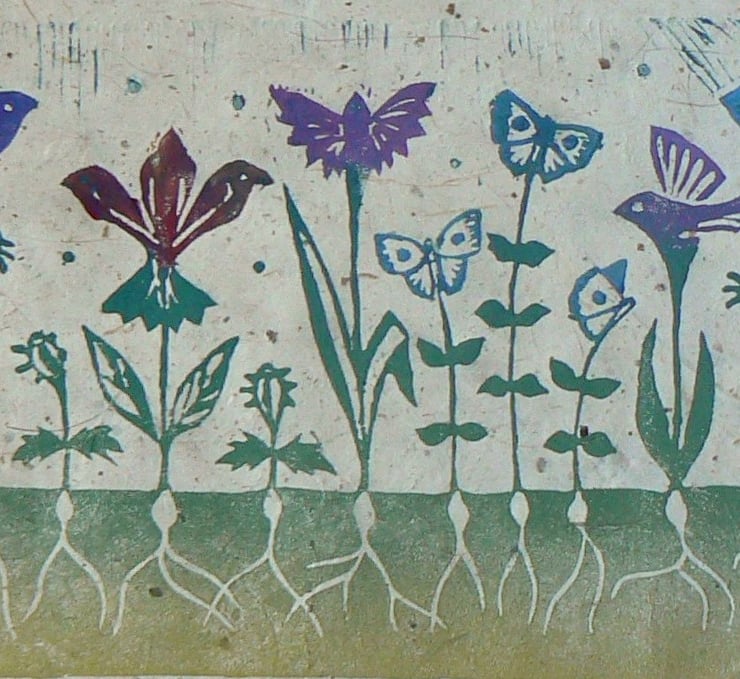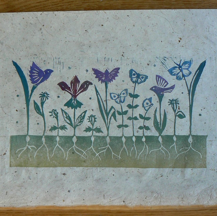 This linocut is hand printed in several coloured inks which mix together in one layer. It is printed on handmade paper made from lokta, which Jane loved to work with.