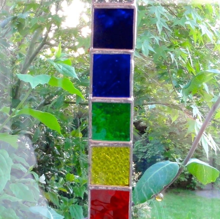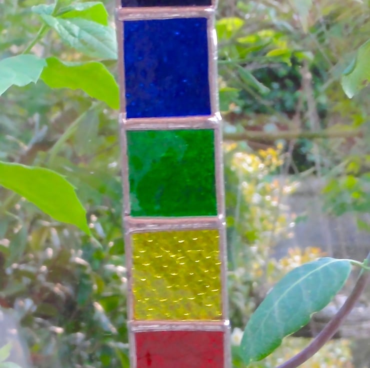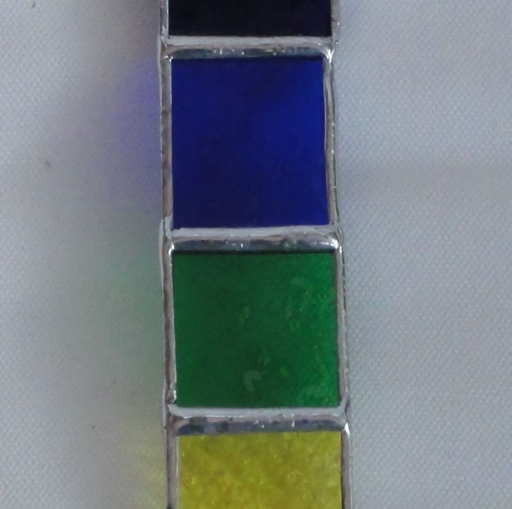 The strip has been made from 7 squares of stained glass. The glass used is red cathedral glass, red corrella glass, orange corrella glass,yellow hammered glass, green wissmack glass, cobalt blue restoration glass, deep purple restoration glass and mauve muffle glass. Each square measures approx 3cms x 3cms. Each piece has been copper foiled and then soldered together to form the stip.
