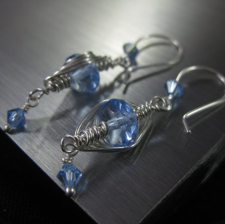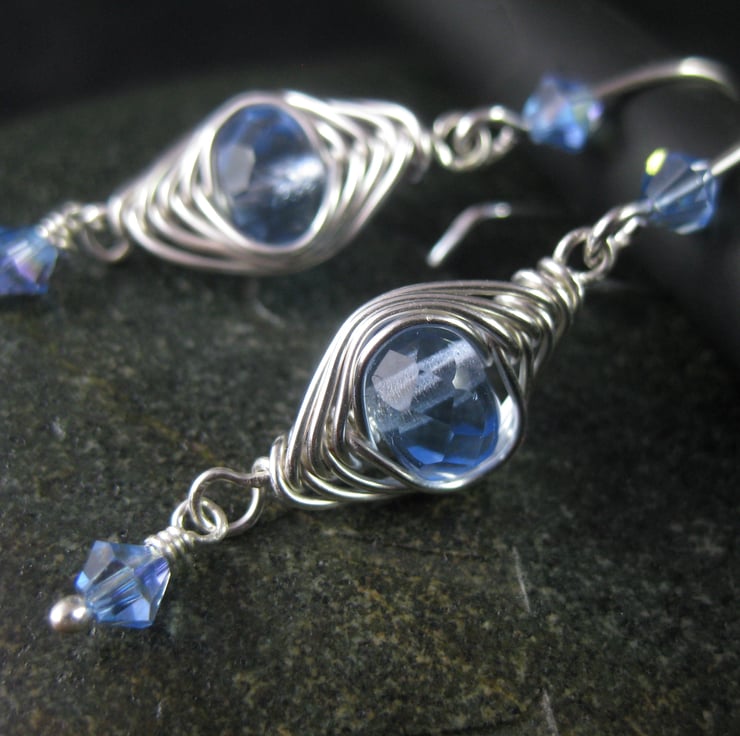 Handcrafted sterling sliver wire in a herringbone pattern wrapped around blue glass beads. There are 3 blue glass beads per earring: 2 are 4mm diameter and the larger one is 8mm diameter. The earrings have a 2.5cm drop from the sterling silver earring wires. They measure 4cm in total from the top of earring wire.