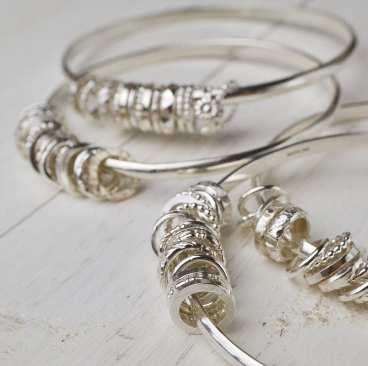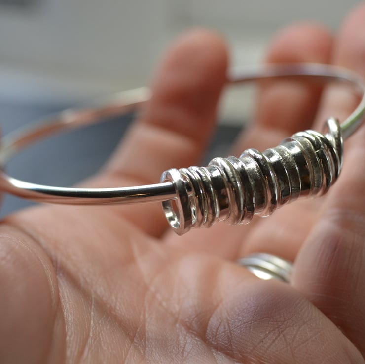 The 2 x 4mm D shaped bangle is hand made in sterling silver and is 65mm in diameter as standard (please contact me should you request a different size). It holds 15 little rings; a mix of different wire shapes; rectangle, square, etched, dotty.