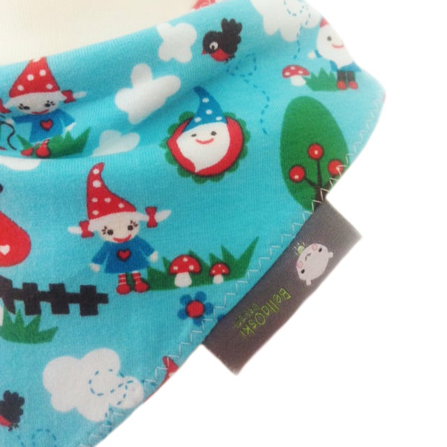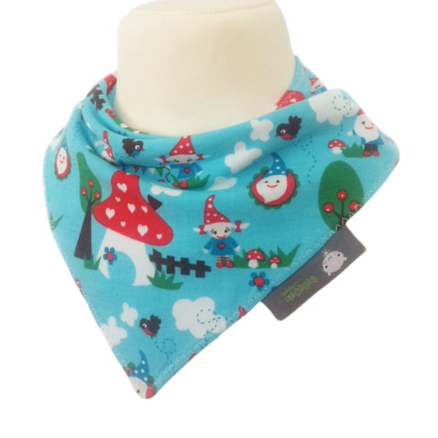 Specially sourced fabric from Germany - this is a gorgeous Cotton Jersey Fabric Baby Bandana Dribble Bib with the cutest of print of a fantasy Gnome world on a Blue background. Perfect for your gorgeous little onel! Made from 100% Organic Cotton jersey and lined with an ultra soft and absorbent fleece fabric to keep clothes dribble free and looking ULTRA cute!