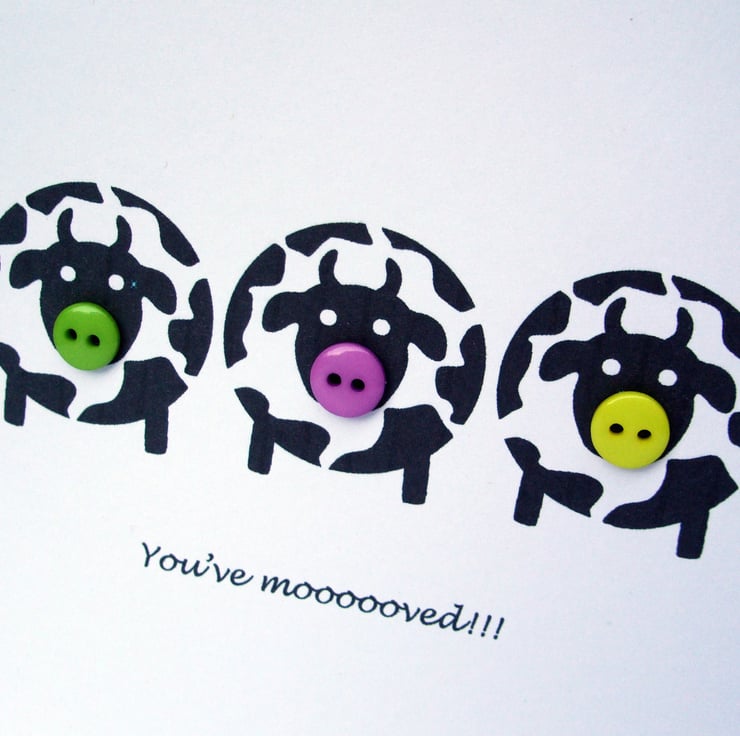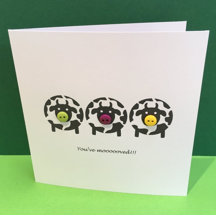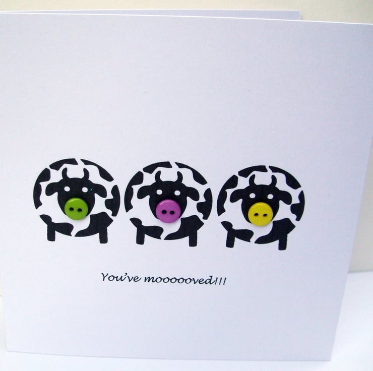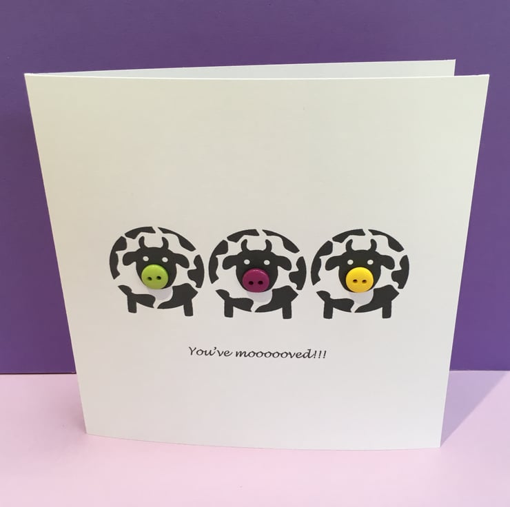 This fun moving house card has three little cows with button noses with the text beneath 'You've moooooved!!'