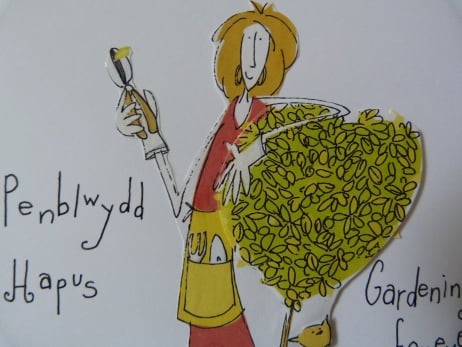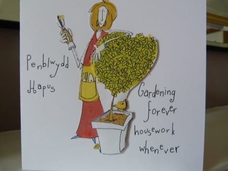 A fun figure of a lady pruning a tree decoupaged onto quality white paper. The words, Gardening forever, housework whenever handwritten in black ink. Finished off with penblwydd hapus, meaning happy birthday in Welsh.