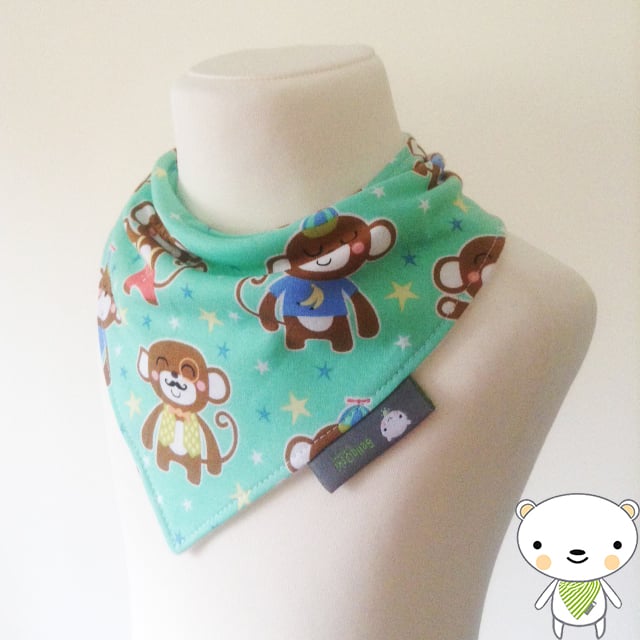 Perfect gift for your little Girl or Boy. Cheerful, Cheeky Chimps on a Green background this lovely fabric by Michael Miller. Give that perfect Hip & Trendy Edge to their outfit with this fab n funky Bib. Made from 100% Cotton and lined with a soft and ultra absorbent fleece fabric keeping moisture away from their chests.