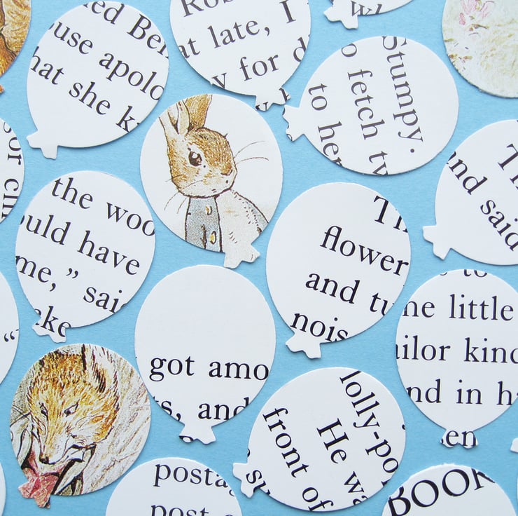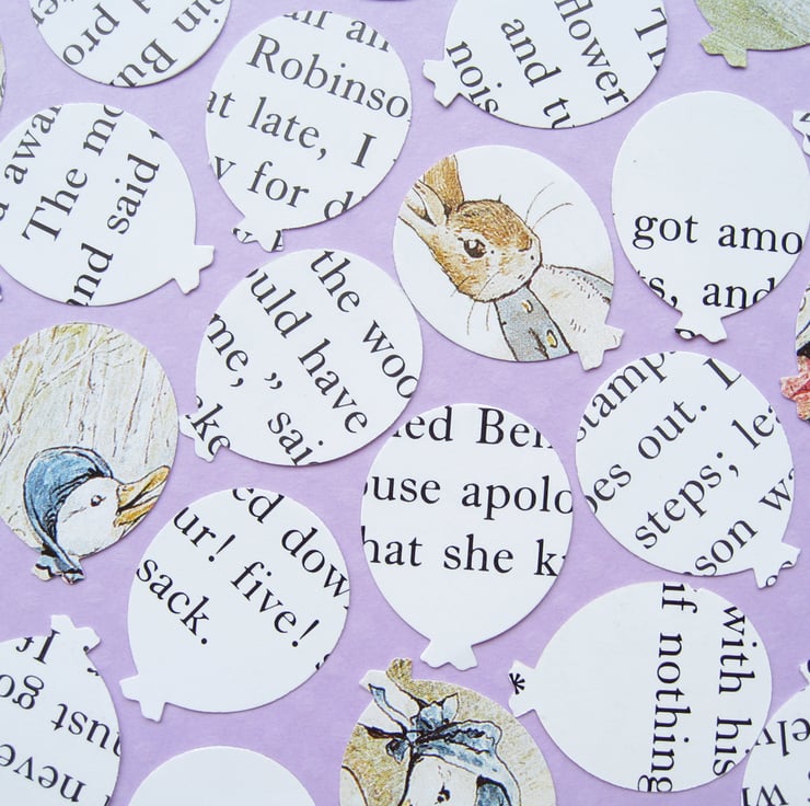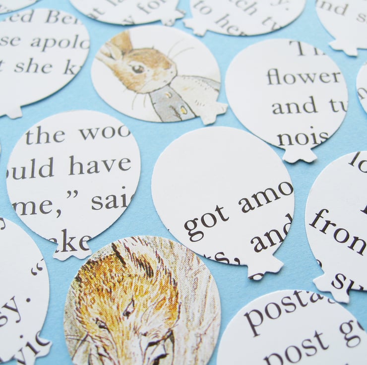 Delicate shapes hand punched from the books of Beatrix Potter's 23 tales can add an extra touch to a special occasion or project. They can be used in many ways: