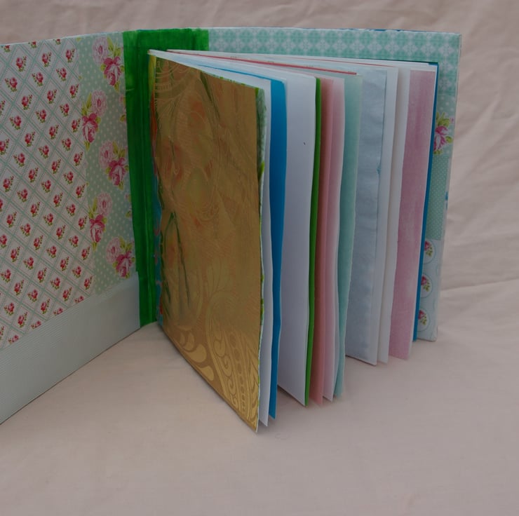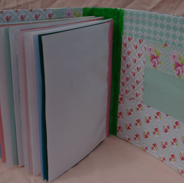 The inside front hardcover has been decorated in a patchwork mix of greens, pinks flowers, spots, stripes and patterned card stock. I have also hand paint the inside spine in green.