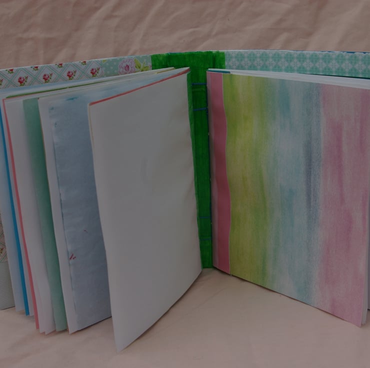 There are three signatures inside the book each one has been hand sewn into the book with blue embroidery thread. The pages are a mix of upcylced and new paper and card stock. There are a mixture of white, pink, blue and green coloured pages.