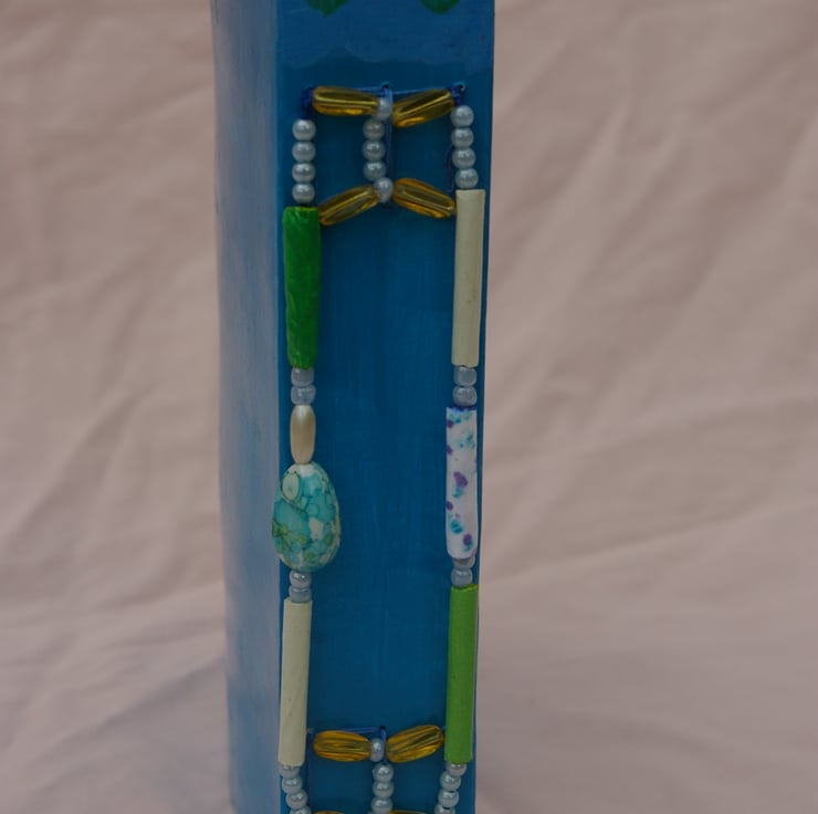 The spine has four small hearts two at the top and two at the bottom of the spine in green. I have further decorated the spine with a selection of beads. Some of the beads I have handmade for the book.