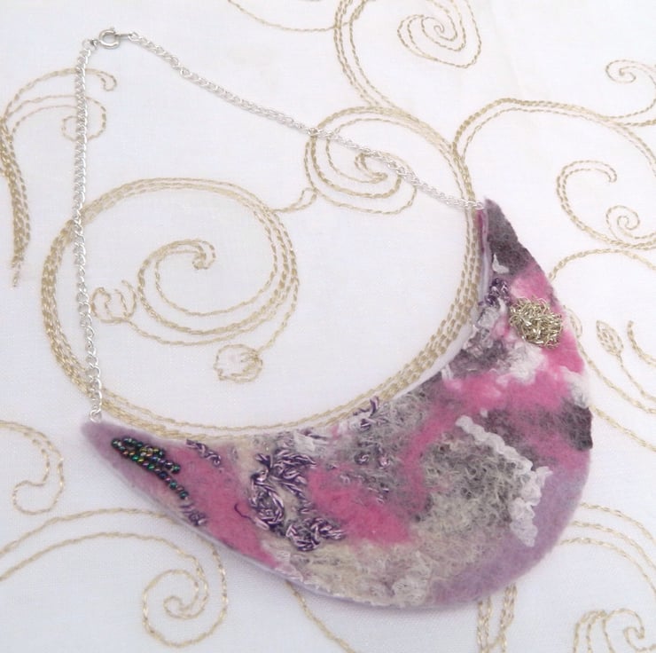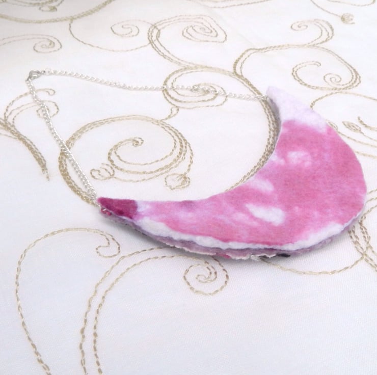 Pink Felt Summer Necklace Crescent Half Moon Shape, Handmade Felt Textile Fabric Radiant Orchid.