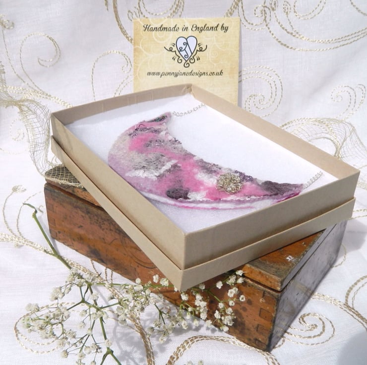 I never use shop bought felt in my work. Each piece goes through a dry needle felting or wet felting process (sometimes both!) producing a unique finish unlike any factory made felt. This piece has a variety of different silks and threads added during the making.